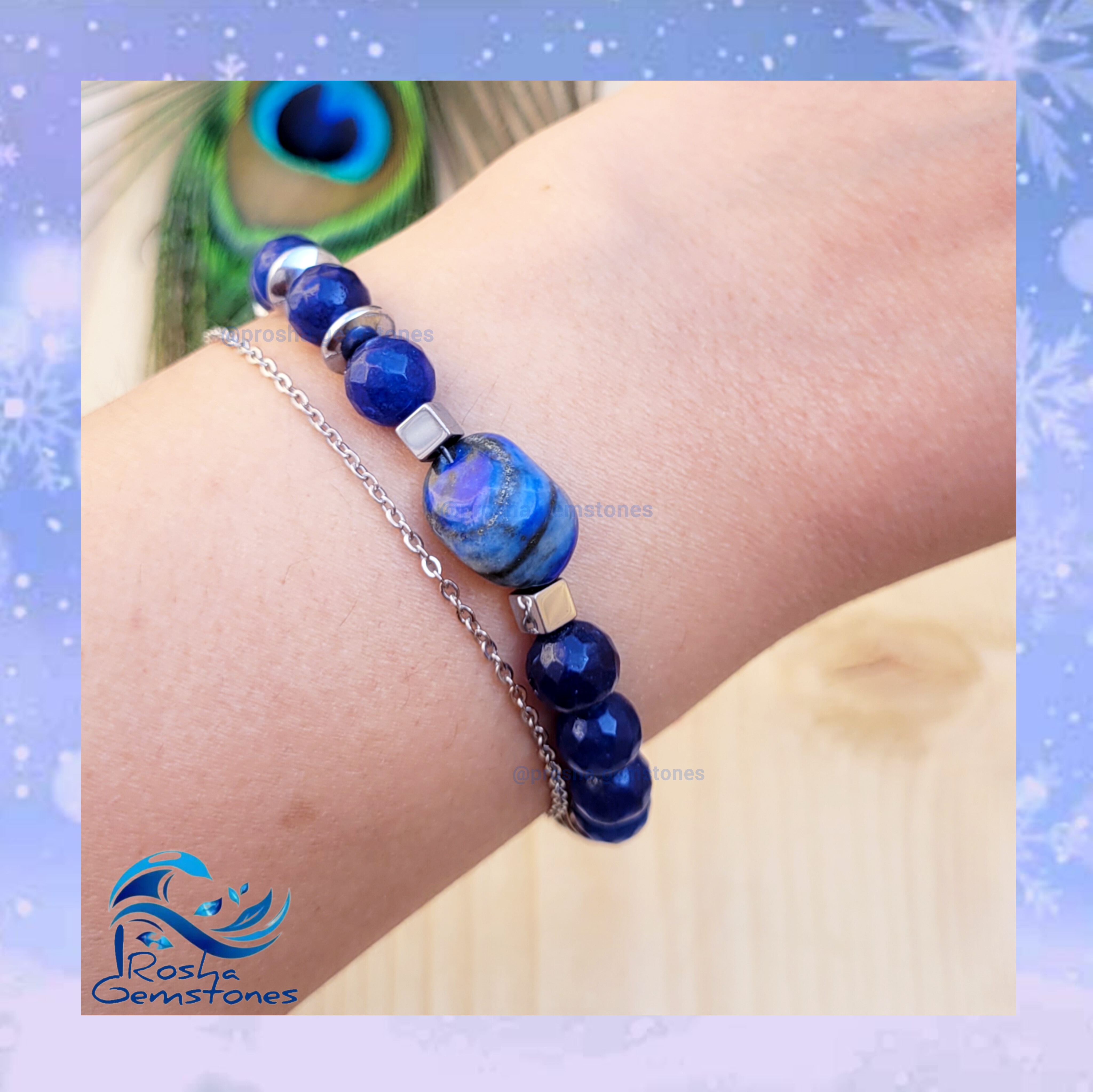 دستبند ترکیبی سنگ لاجورد، جید آبی و حدید