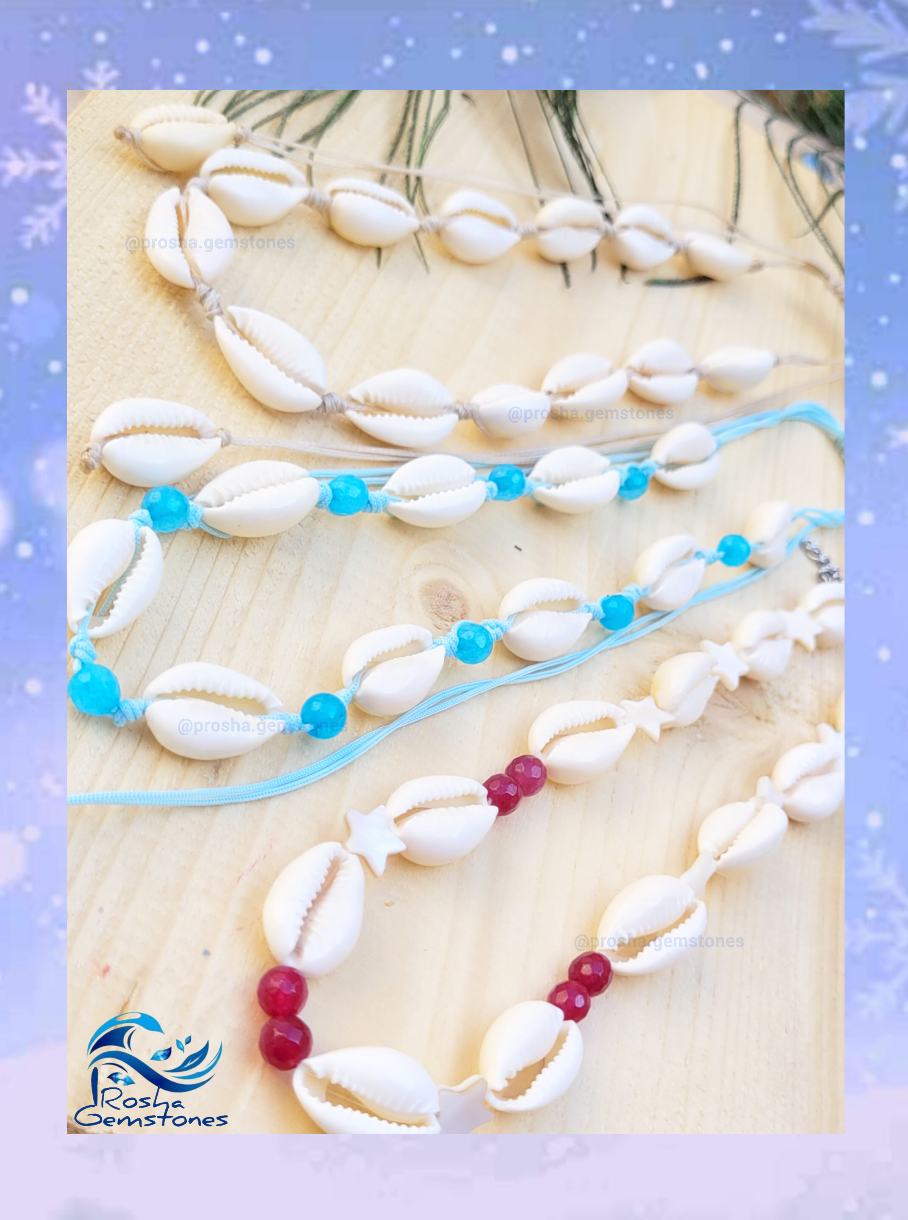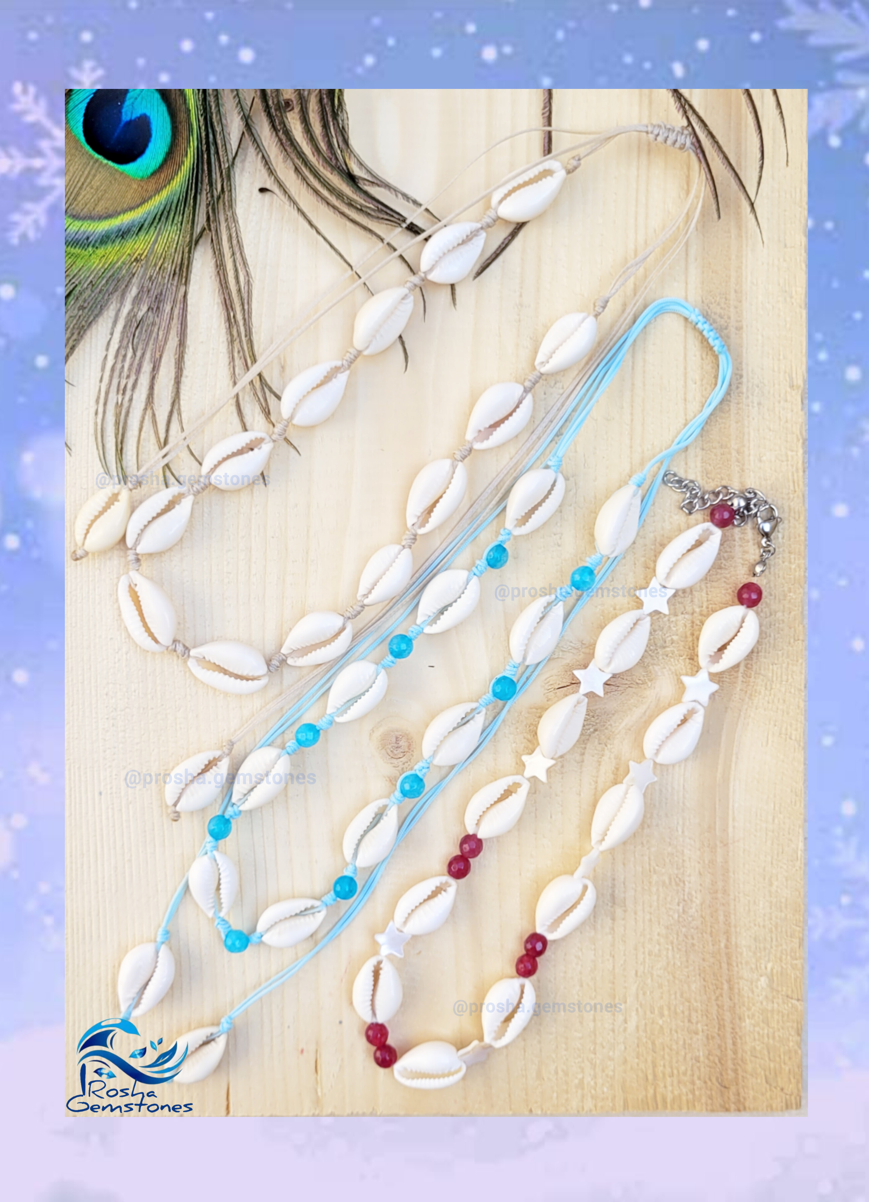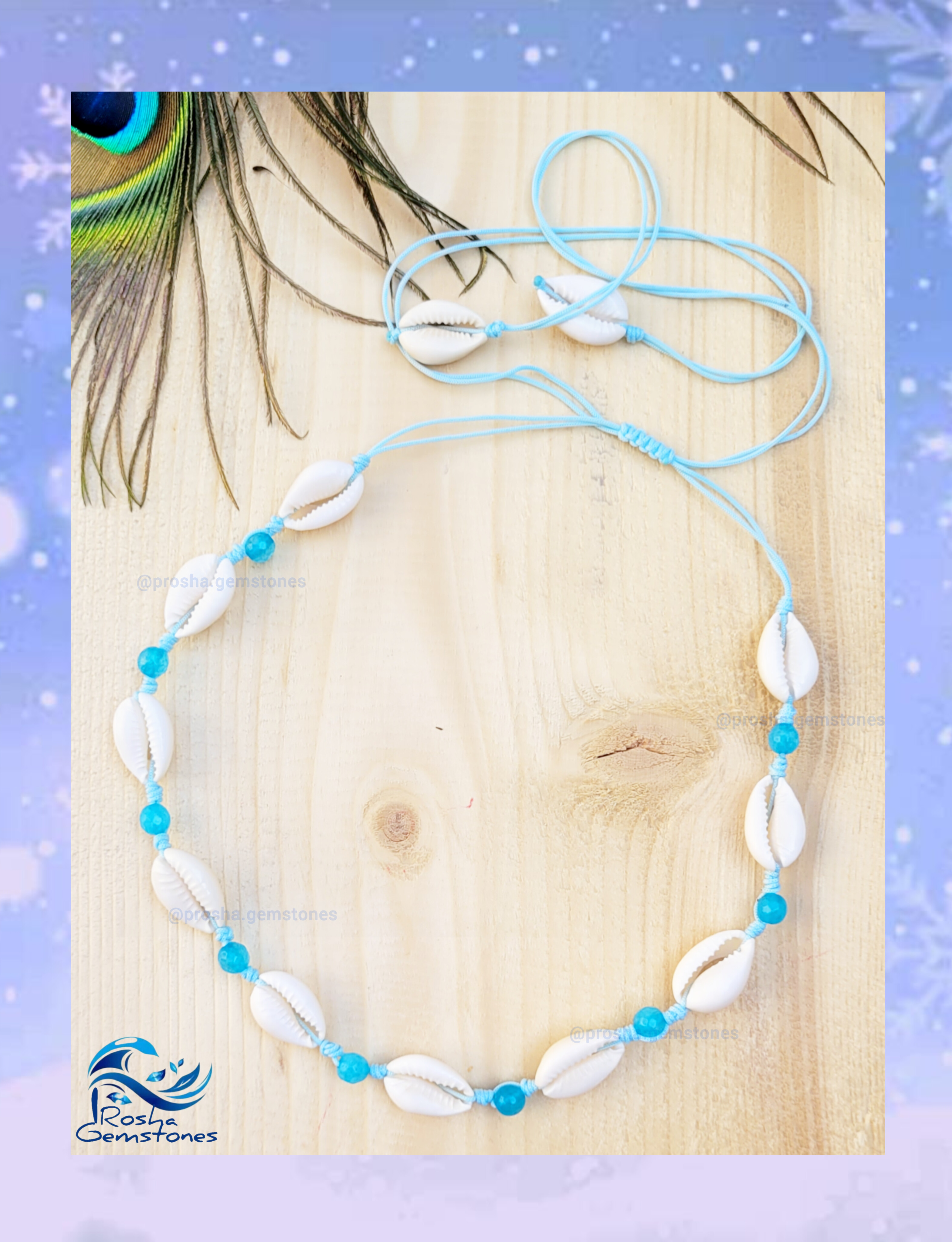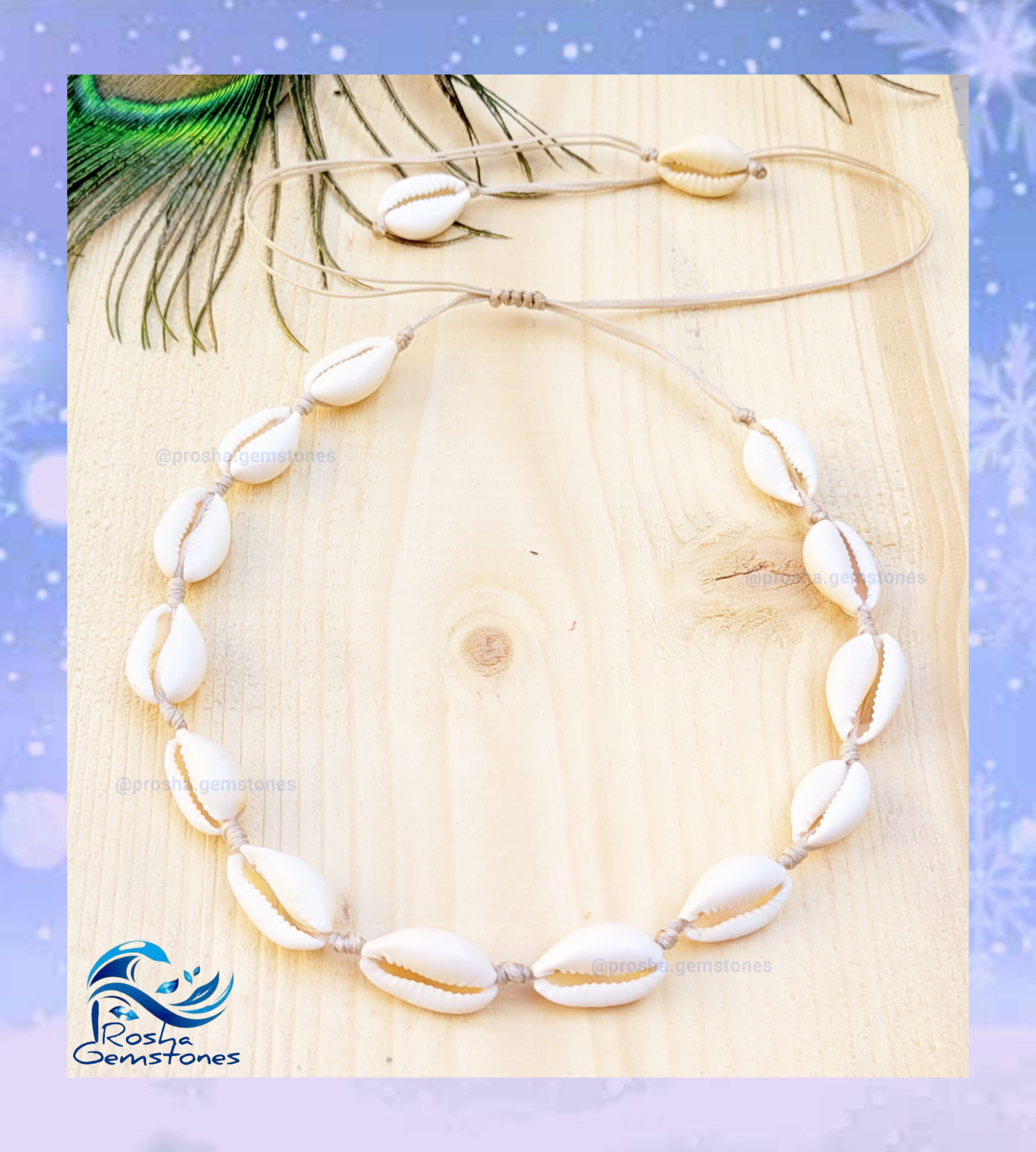 این گونه از حلزون که برای گردنبندهای بالا استفاده شده، حلزونهای کوری (Cowrie or cowry)، از خانوادهی حلزونهای سیپرا هستن.