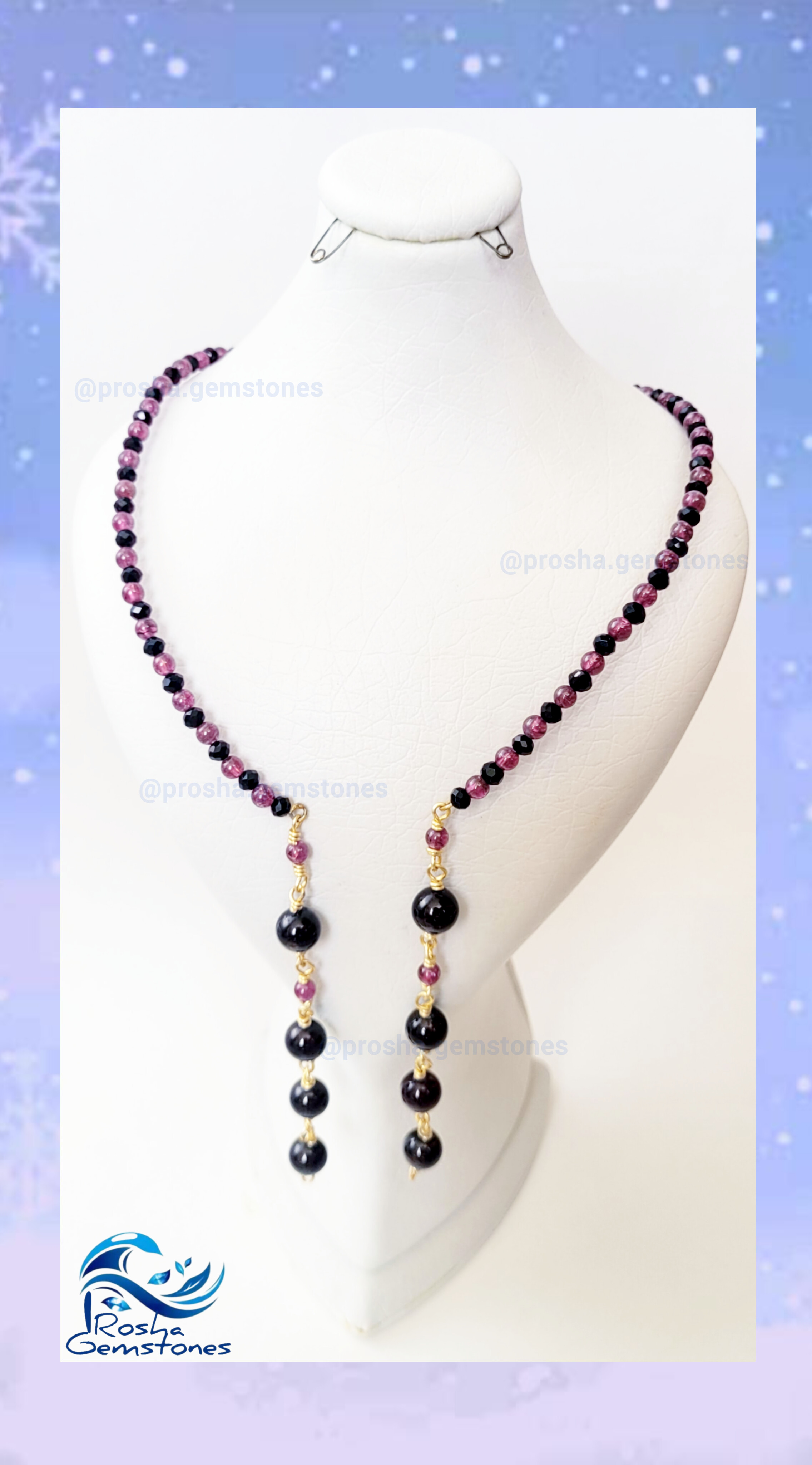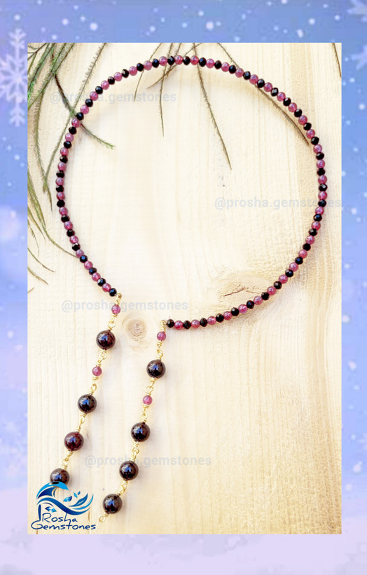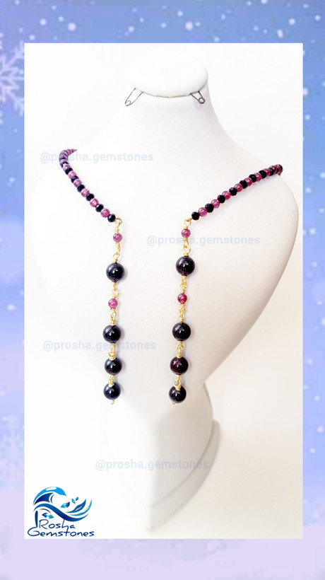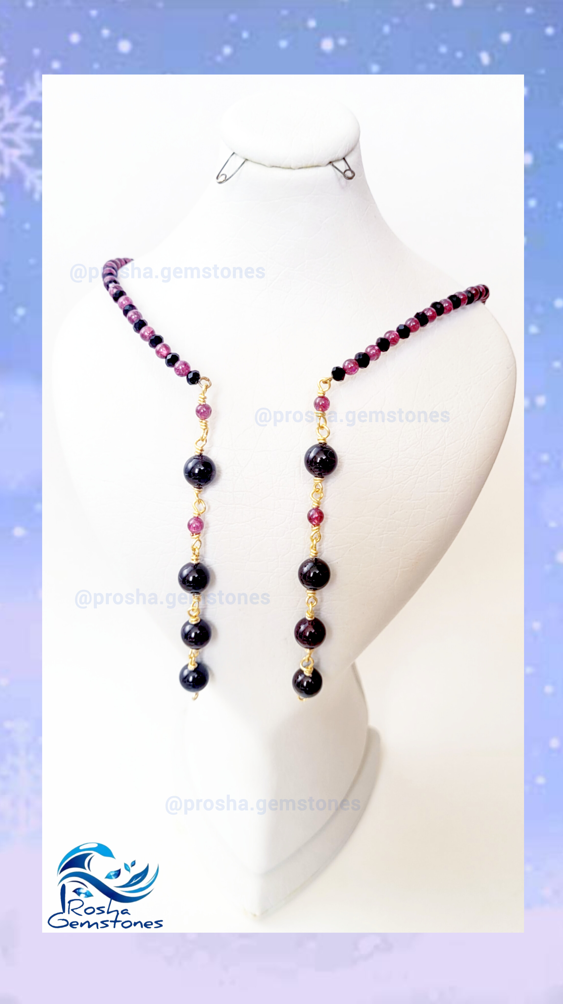 سنگهای سایز کوچک گارنت این گردنبند سرخ مایل به بنفش و سنگهای بزرگتر قرمز آلبالویی تیره هستن. این گردنبند قابل استفادهی دو طرفه ست. هم میتونید قسمت آویز رو جلوی گردن قرار بدید و هم اگر لباس پشت باز پوشیدید، قسمت آویز رو به سمت پشت گردن قرار بدید و جلوهی بیشتری ایجاد کنید.