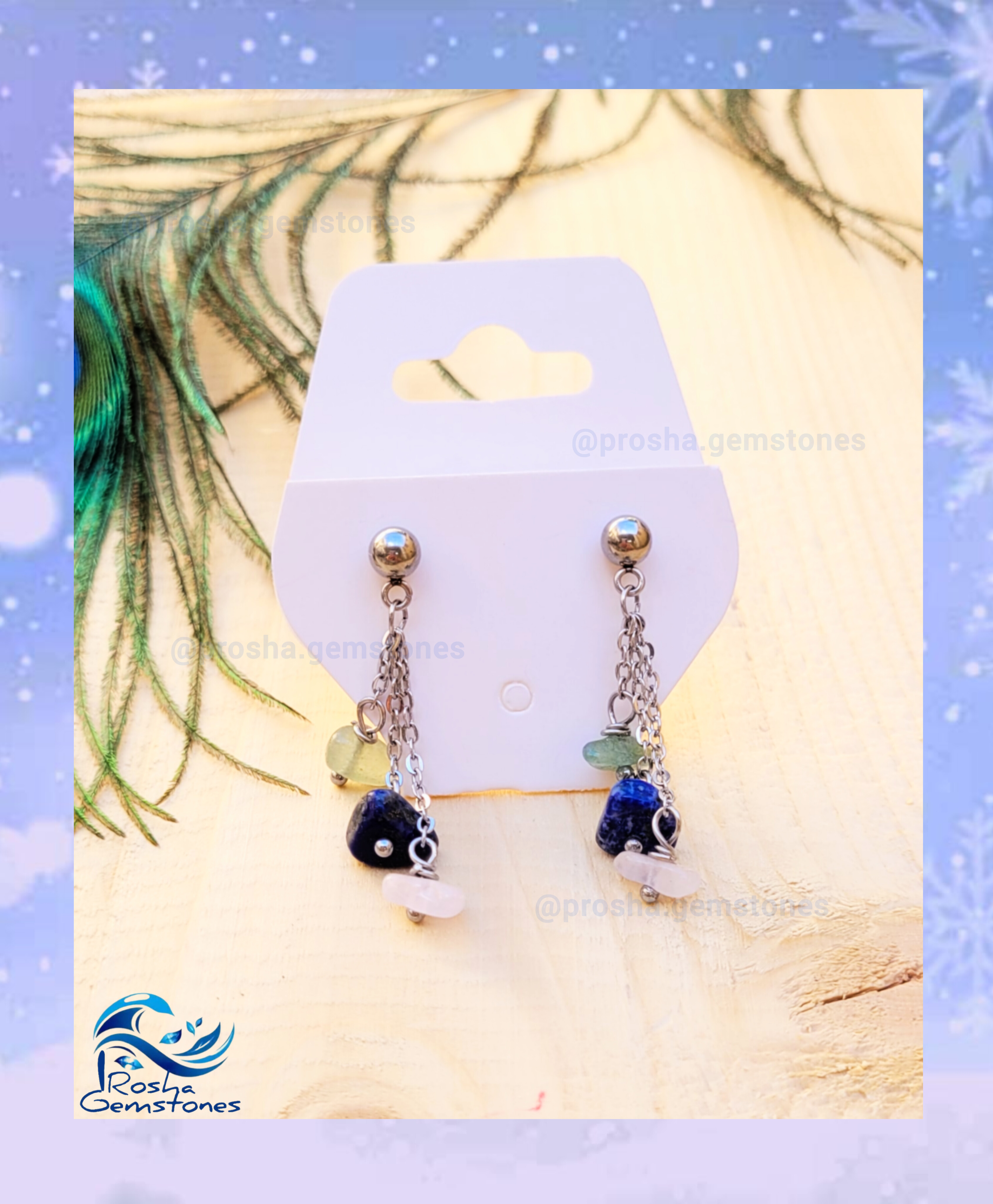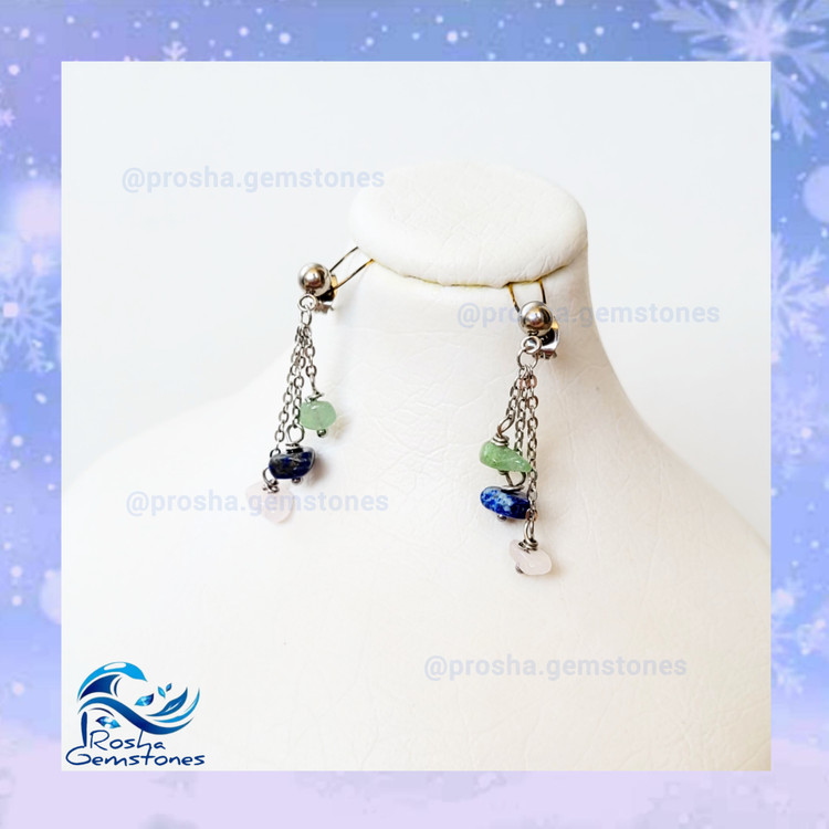 یک گوشوارهی ظریف و در عین حال بسیار زنانه. سنگهای لاجورد، رزکوارتز و آونتورین در این گوشواره به کار رفته که سنگهای چاکرای قلب و گلو هستن. پایه گوشواره میخی و زنجیرهای به کار رفته استیل و رنگ ثابت هستن.