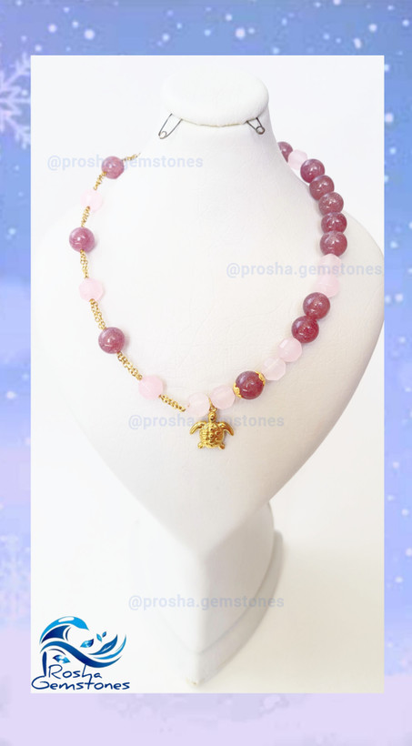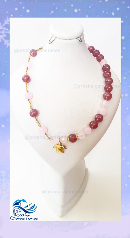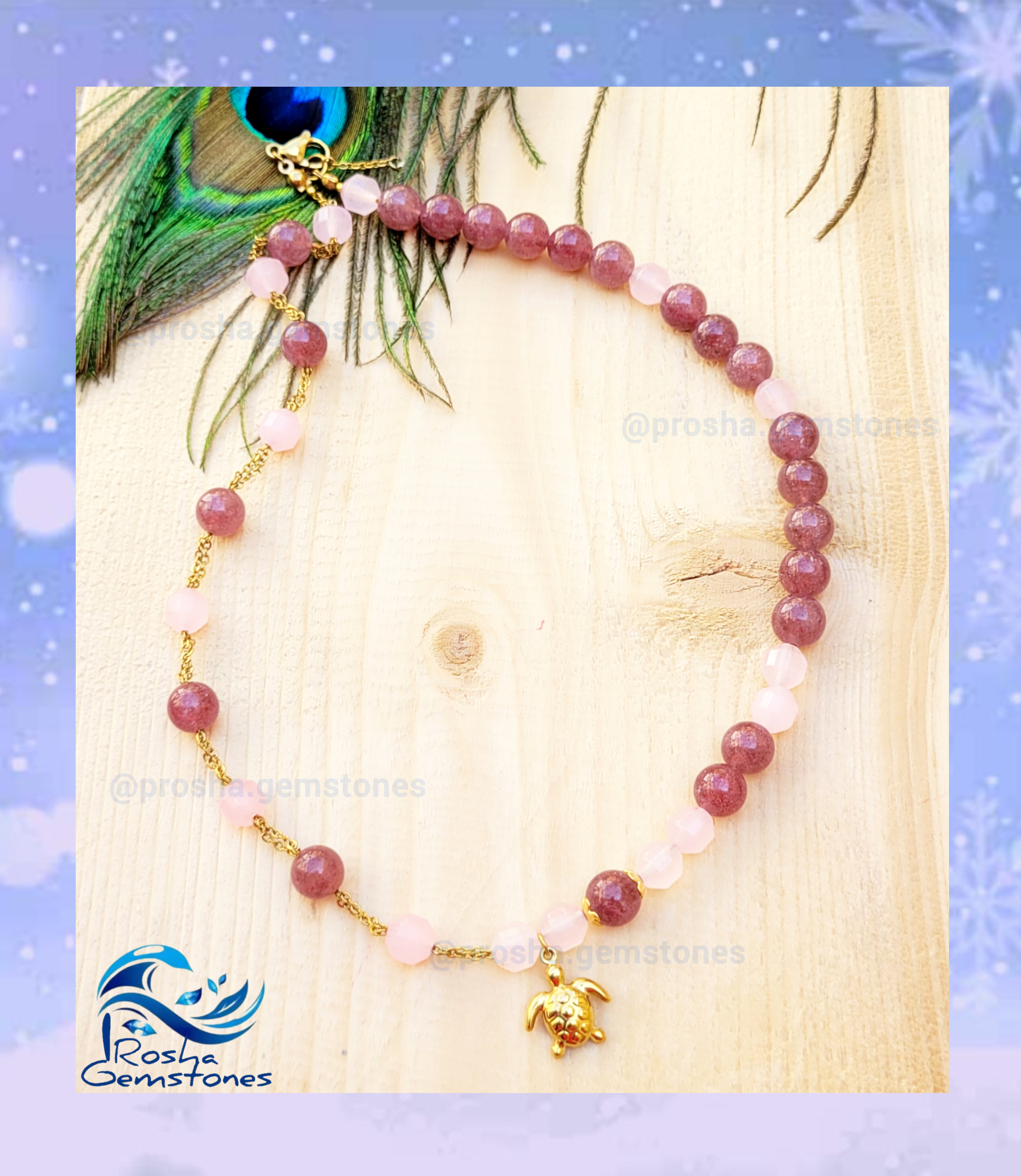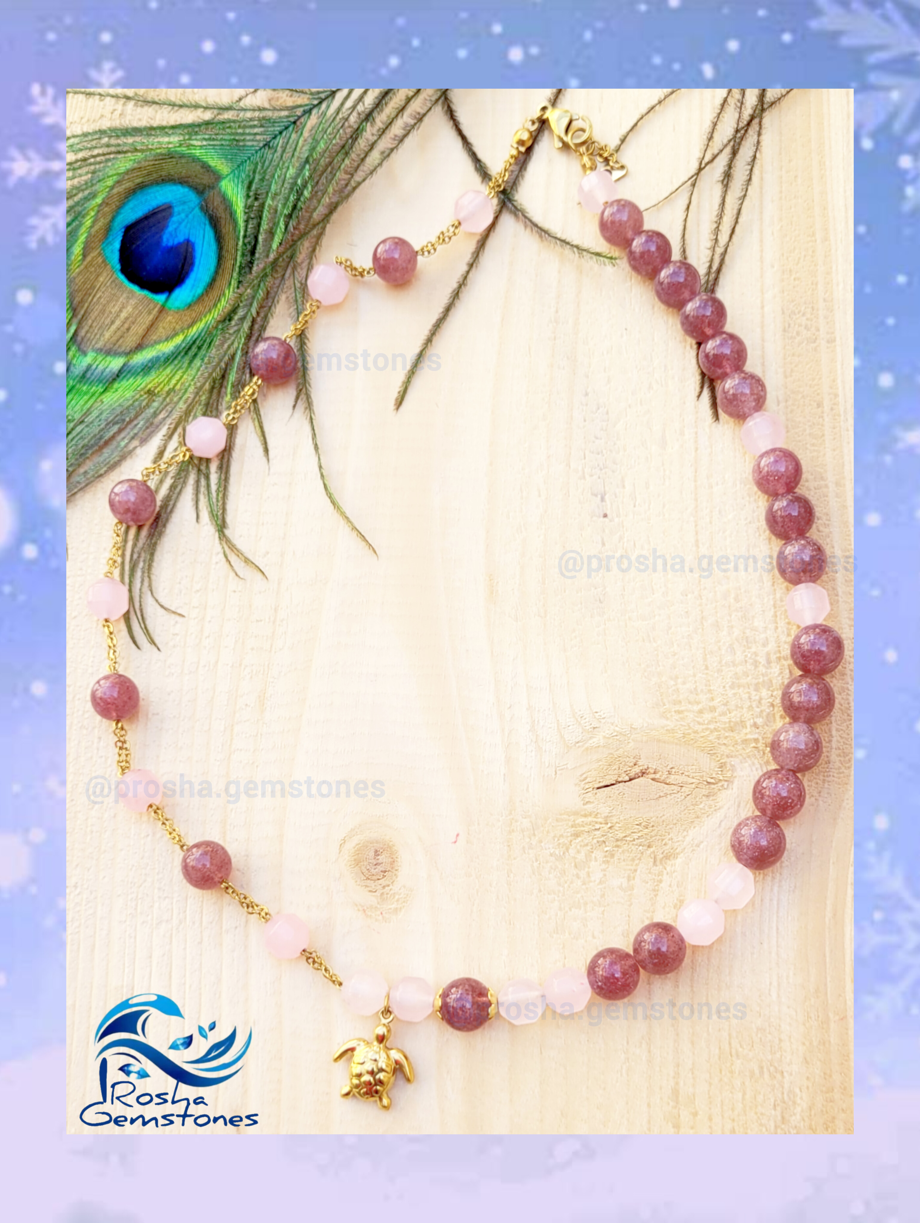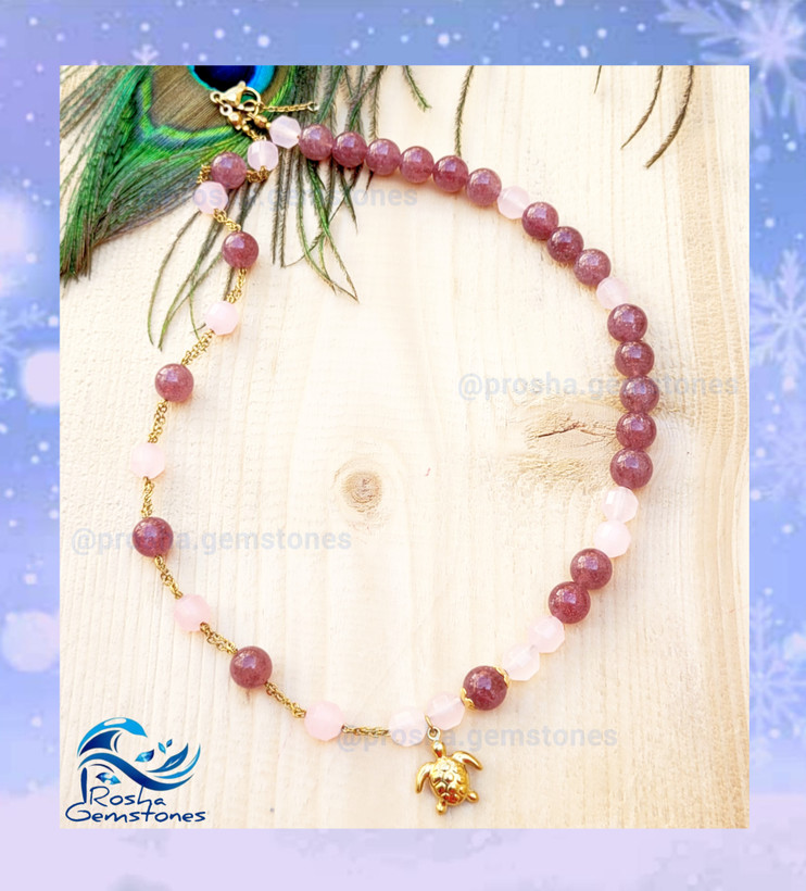 سنگ چری کوارتز یا همان کوارتز توت فرنگی و سنگ رزکوارتز که در ساخت این گردنبند استفاده شده، هر دو سنگ چاکرای قلب هستن. زنجیر، قفل و پلاک گردنبند همگی استیل و رنگ ثابت هستن.